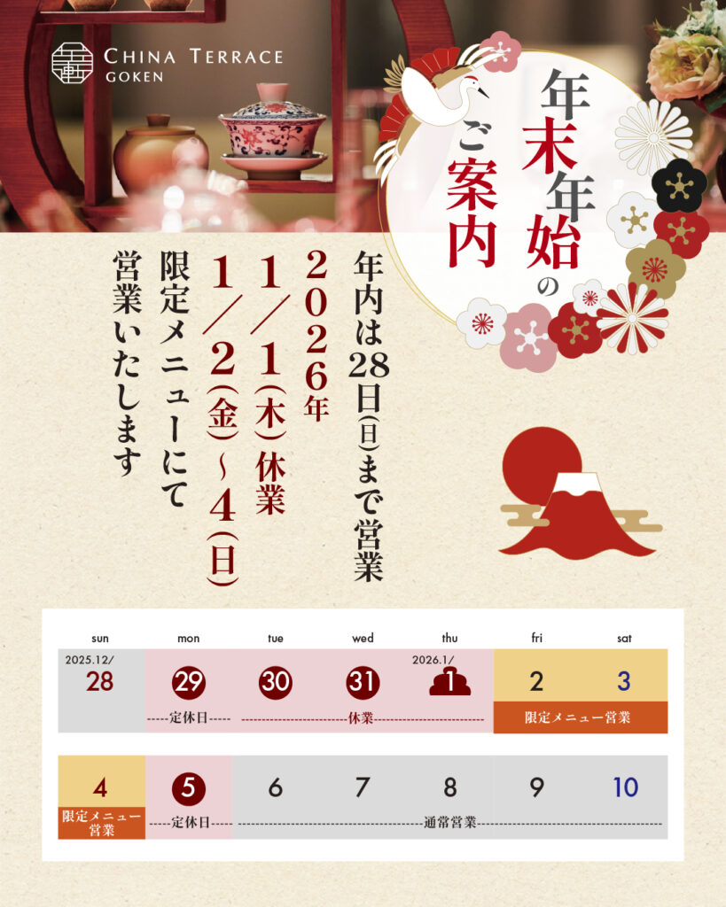 チャイナテラス五軒、年末年始営業日は以下の通りとなります。