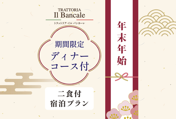 3F「トラットリア・イル バンカーレ」の年末年始限定ディナーコース(¥12,000コース)が付いた、夕食・朝食の2食付プランです。